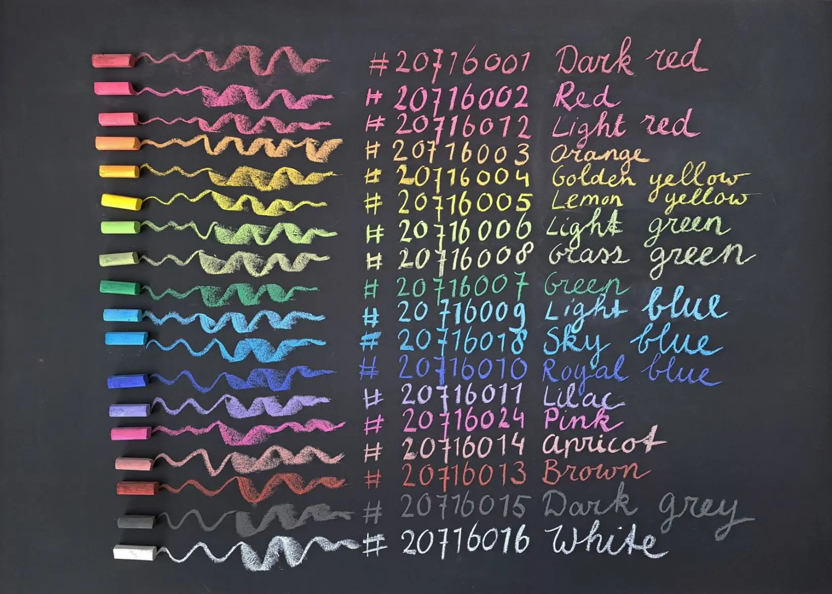 Kreda do tablic Art Makes Sense to wyraziste kolory prosto z natury! Kreda została wykonana wyłącznie z naturalnych pigmentów, bez dodatku syntetyków. Idealna do pięknego rysowania i pisania – ma doskonałą konsystencję: wystarczająco twarda do pisania, miękka do rysowania i odporna na łamanie.