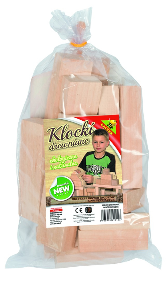 Mały zestaw drewnianych klocków charakteryzuje się długoletnią trwałością. Twoje dziecko może zatem korzystać z niego bez żadnych ograniczeń! Klocki są wyprodukowane z ekologicznego drewna. Kompletny zestaw jest zapakowany w foliowy worek.